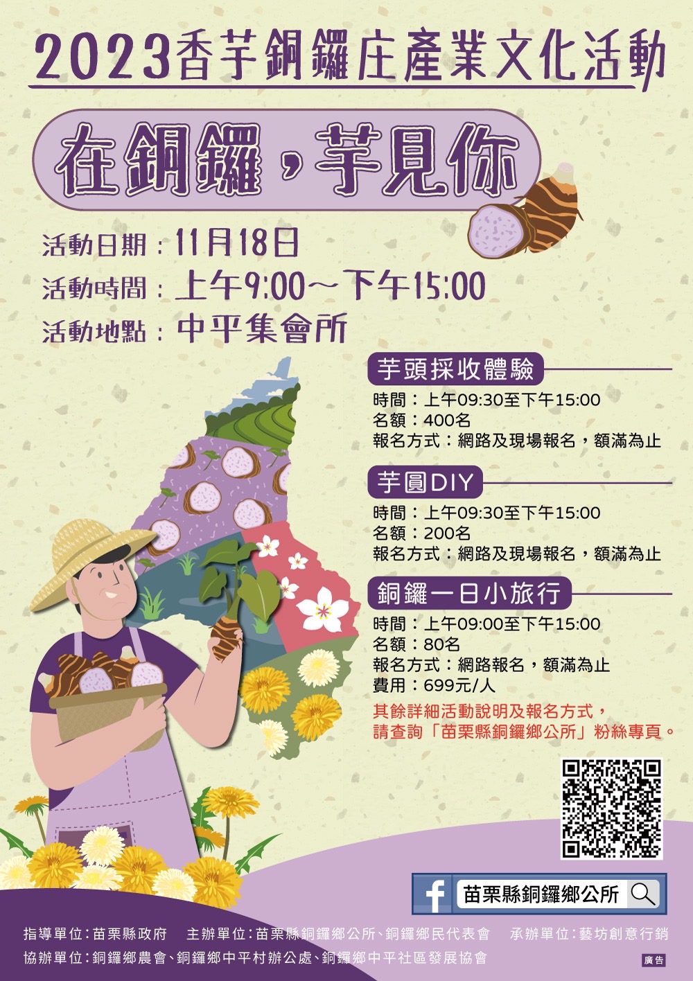 | 三、 | 活動內容:採芋體驗、芋圓DIY、芋頭美食品嘗、小農市集、闖關遊戲、一日小旅行、摸彩抽黃金(詳如活動宣傳海報),更多資訊可上「苗栗縣銅鑼鄉公所」FB粉絲專頁搜尋追蹤。 |